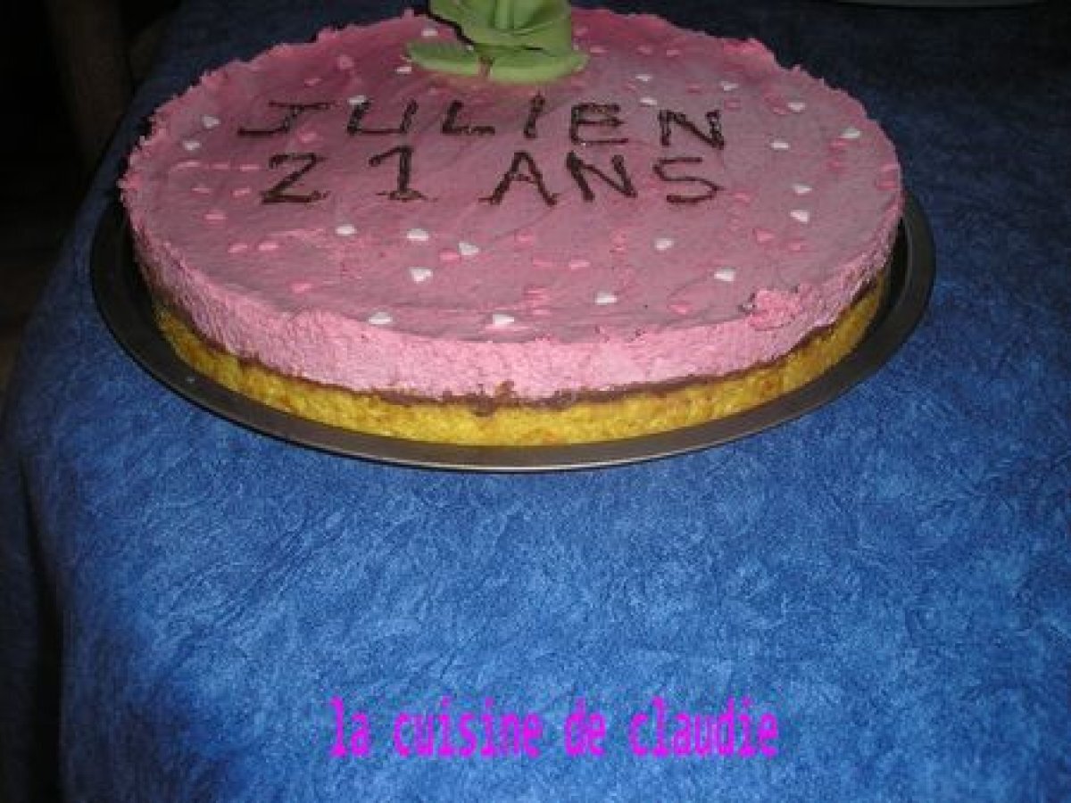 Voici un gâteau d'anniversaire composé d'une génoise, d'un croustillant et d'une mousse de framboise.