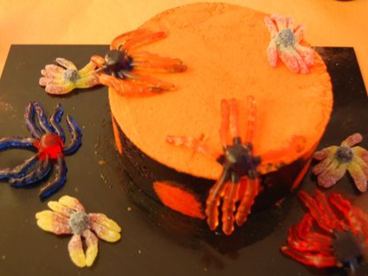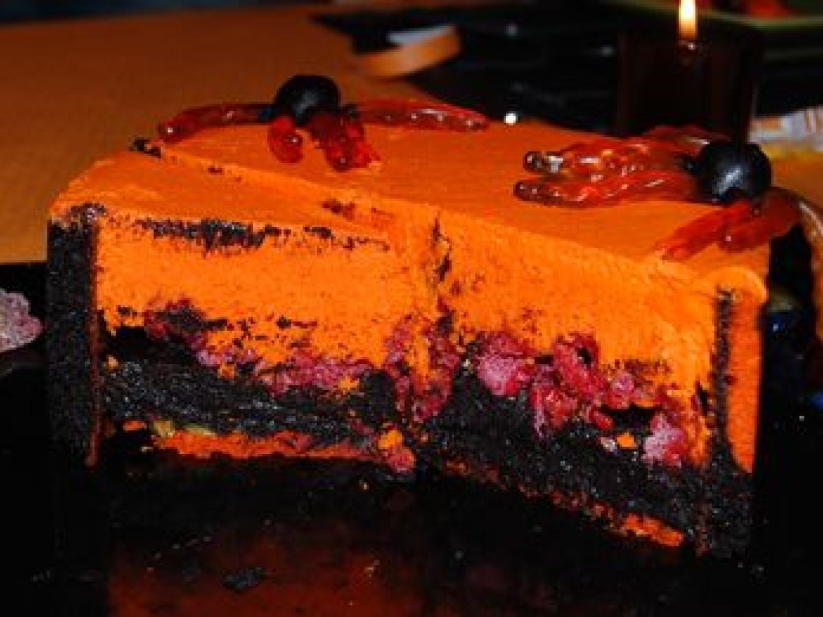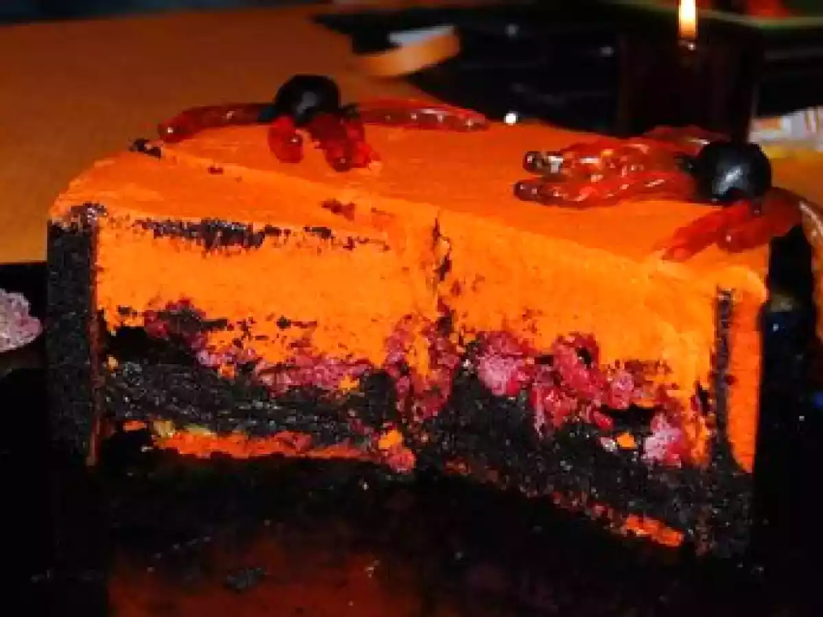Gateau d'halloween orange et noir, saveur pistache framboises