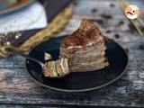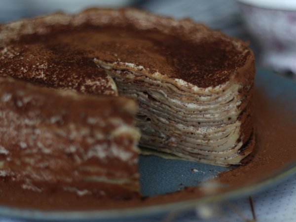 Placer une crêpe dessus, étaler de la crème tiramisu dessus et saupoudrer à nouveau de cacao. Répéter l'opération jusqu'à la dernière crêpe.
