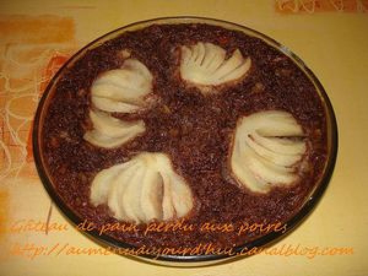 Gateau de pain perdu chocolat poires Dessertfacile1 h 5 m979 Kcal Envoyer cette recette à un ami Imprimer cette page Poser une question à l'auteur Publier votre photo de cette recette Ingrédients 2 250 g de pain rassis ½ l de lait 3 oeufs 100 g de sucre 20 g de beurre 2 cuillères à soupe de cacao 2 poires Coût estimé: 3.16Euros€ (1.58€/part)