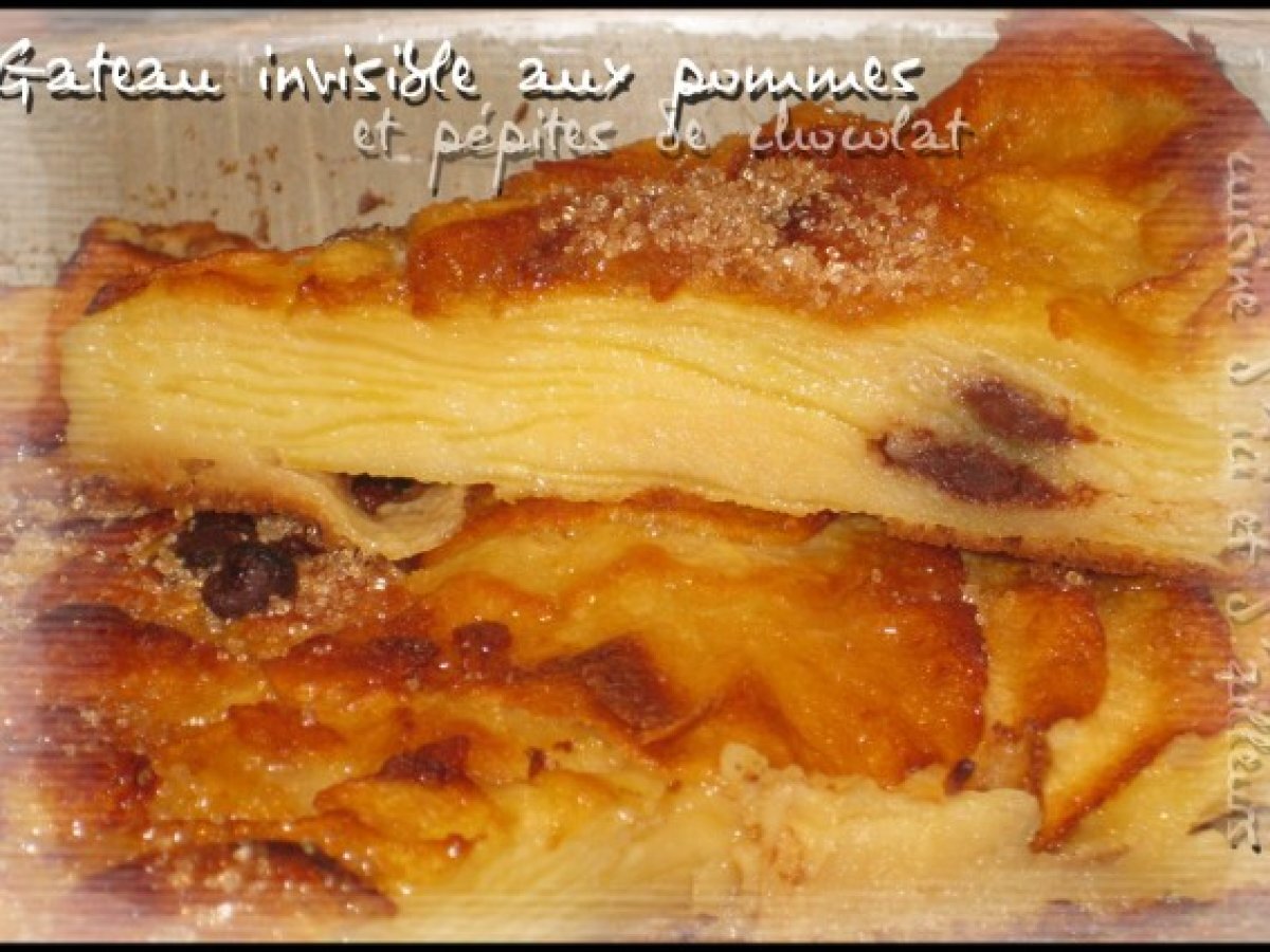 Gateau invisible aux pommes et pépites de chocolat Dessertfacile45 min515 Kcal Envoyer cette recette à un ami Imprimer cette page Poser une question à l'auteur Publier votre photo de cette recette Ingrédients 3 4 pommes Pépites de chocolat 2 oeufs 10 cl de lait 70 g de farine 20 g de sucre 20 g de beurre fondu 1 sachet de levure chimique 1 cuillère à soupe d'arôme vanille 1 pincée de sel Coût estimé: 3.63Euros€ (1.21€/part)