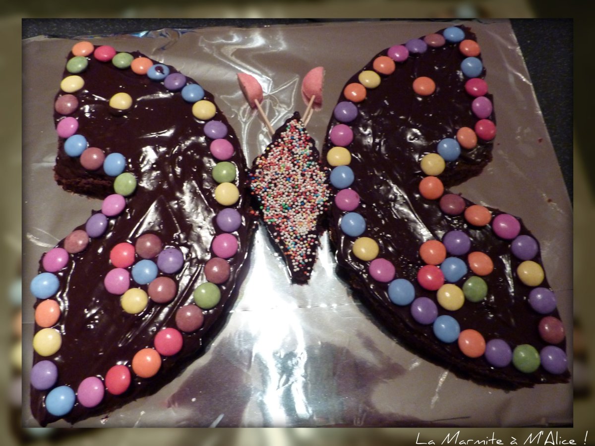 Gâteau papillon Dessertfacile23 min655 Kcal Envoyer cette recette à un ami Imprimer cette page Poser une question à l'auteur Publier votre photo de cette recette Ingrédients 8 200 g de chocolat noir 200 g de beurre salé 200 g de sucre en poudre 6 oeufs 100 g de farine 1 sachet de levure 1 cuillère à soupe de rhum (je rappelle que l'alcool s'évapore à la cuisson ;-)) Glaçage : 200 g de chocolat noir 50 ml de lait Coût estimé: 7.11Euros€ (0.89€/part)