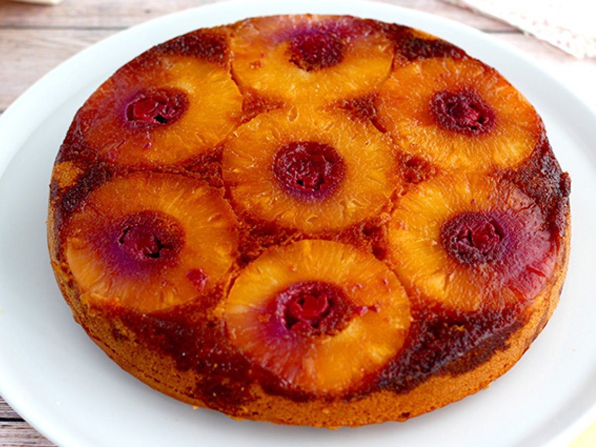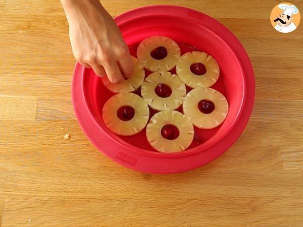 Merci pour cette recette! Personnellement je mien est plus petit mais quand même pour 6 personnes. Je mets au centre une tranche d'ananas entière, et autour 4 tranches coupées en deux qui forment une rosace. Ensuite je mélange dans ma pâte les 5 autres tranches coupées en cubes et j'ajoute 1 c à s de rhum.