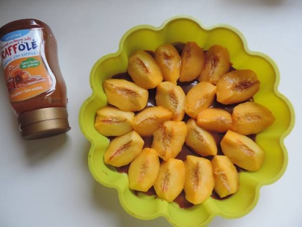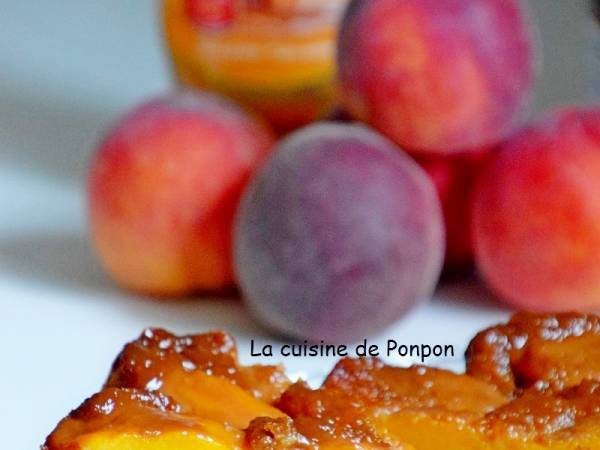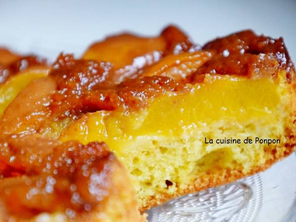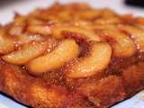 Gâteau renversé aux pêches caramélisées au caramel beurre salé, pain de singe et combava,