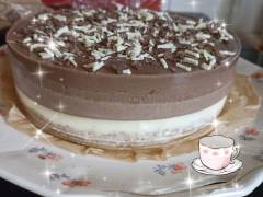 Gâteau excellent. Par contre j'ai utilisé de la gélatine en feuille, j'ai mis la feuille de gélatine dans l'eau froide 10 mn, puis j'ai fait bouillir 125 ml de lait entier et 125 gr de crème 30 %, et le chocolat blanc et hors du feu, j'ai ajouté la gélatine bien fouetté et versé directement sur le biscuit en laissant un temps de pose de 2 h et j'ai réitéré avec les deux autres chocolat au lait et noir de la même façon . Fait la veille et démoulé le lendemain matin. Dans un moule à charnière (bien beurré la feuille sulfurisé au fond) et le moule était de 18 cm