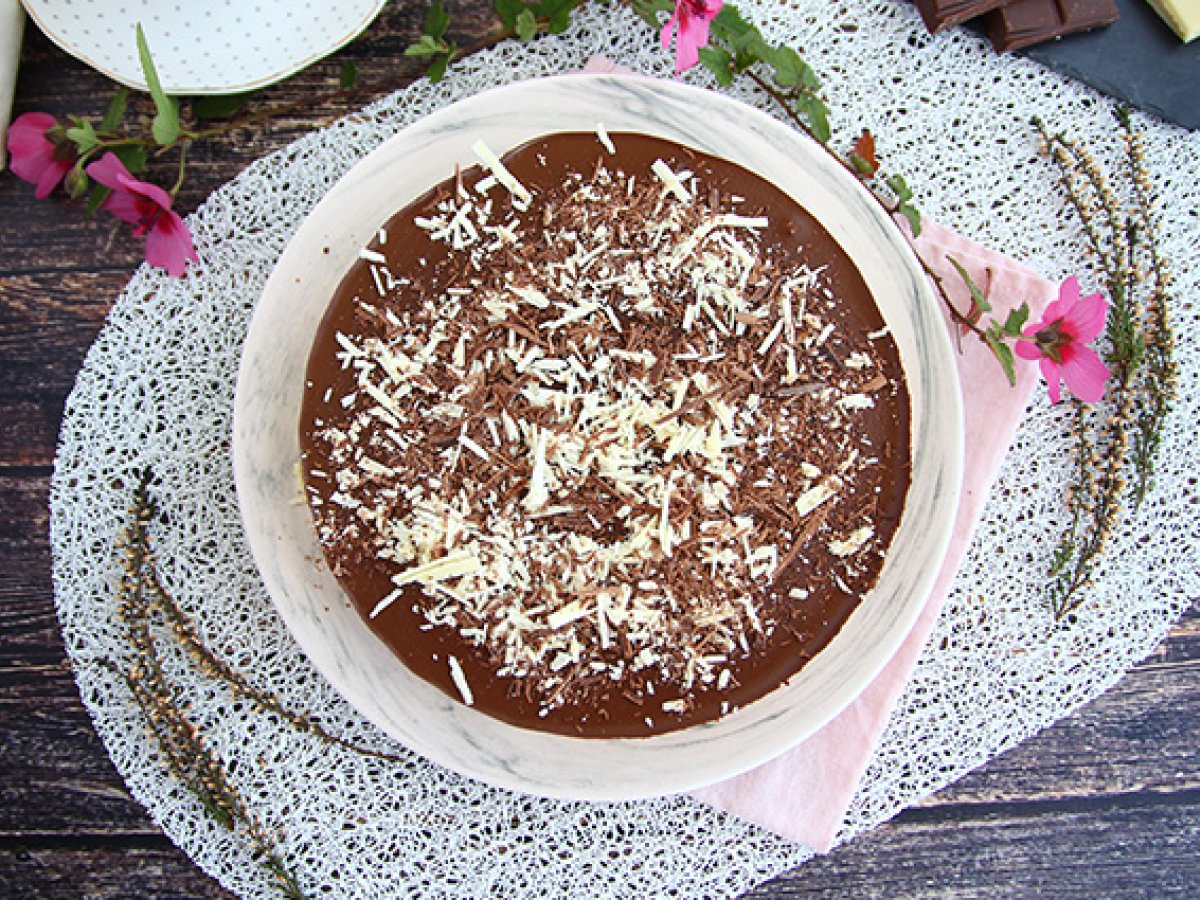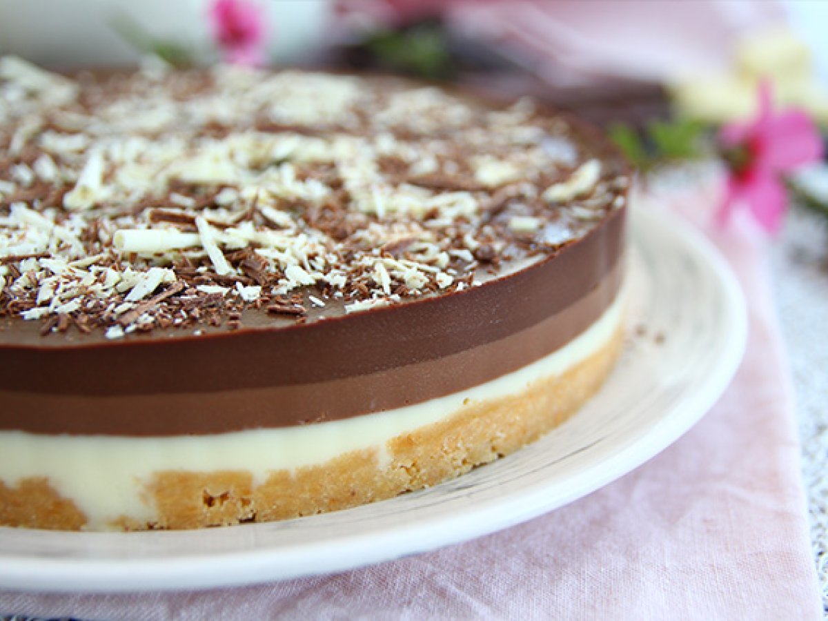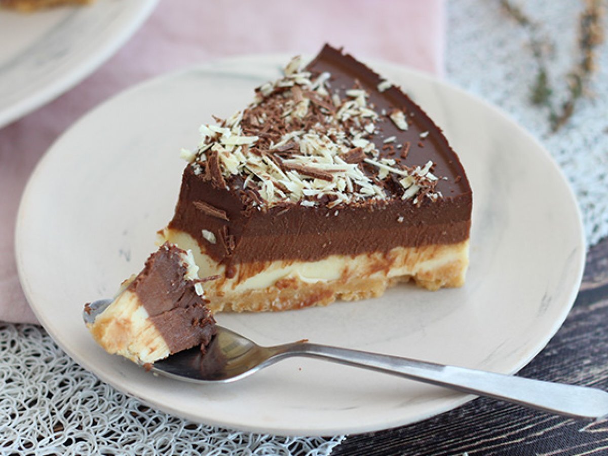 Faire épaissir la préparation en mélangeant de temps en temps. Sortir la tarte du frigo. Avec une fourchette, gratter la surface de la crème chocolat blanc. Verser la préparation au chocolat au lait dessus et mettre au frais 1 heure.