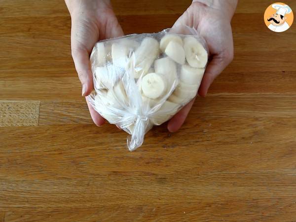 Couper les bananes en rondelles et les placer dans un sac congélation. Mettre au congélateur pendant au moins 4 heures.