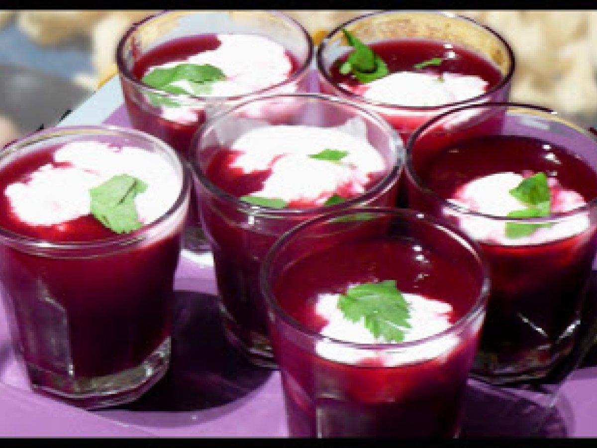 Glace au chèvre et soupe de betterave (avec ou sans sorbetière + technique) Dessertfacile25 min205 Kcal Envoyer cette recette à un ami Imprimer cette page Poser une question à l'auteur Publier votre photo de cette recette Ingrédients 4 Pour la glace: 250 g de chèvre frais 8 cl de lait 4-5 feuilles de basilic ½ gousse d'ail 1 blanc d'oeuf Pour la soupe: 150 g de betterave cuite 24 cl d'eau 20 g de sucre 1 cuillère à café de sel 12 cl de vinaigre balsamique