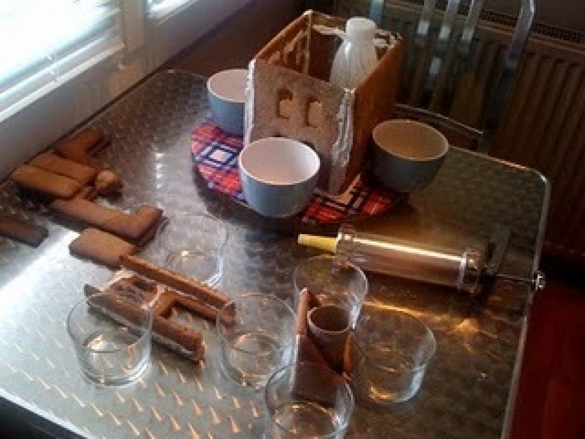 Pour la décoration de votre cabane ou manoir, choisissez votre thème (pour moi Noël), et faites vos achats de biscuits et bonbons en fonction de votre imagination. Tuiles en langues de chats, colonnes et gouttières en cigarettes feuilletées entourées de bonbons fils rouges, une rambarde sur le toit en réglisses, un tas de bûches en mikados , un bord de toiture coloré en dragibus.... Utiliser le glaçage pour fixer les éléments biscuités et bonbons, et en colorer une partie po