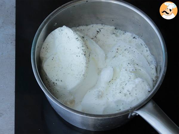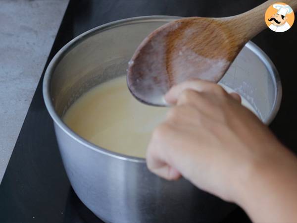 Y ajouter petit à petit le lait bouilli en mélangeant bien, puis remettre dans la casserole et sur feu moyen.