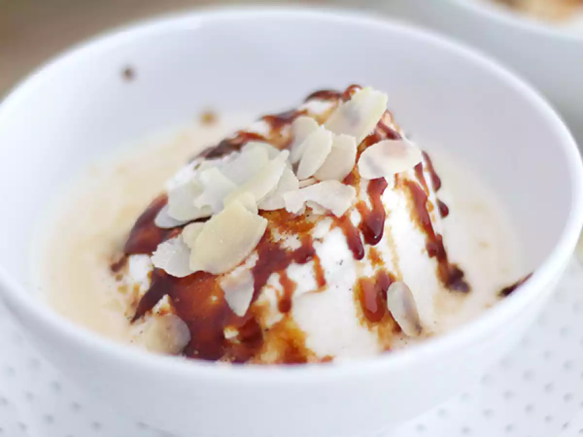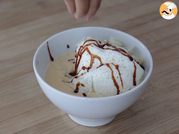 Monter les îles flottantes, en servant dans un bol de la crème anglaise, puis en y déposant un îlot de blanc d’œuf. Faire couler du caramel dessus, puis parsemer d'amandes effilées.