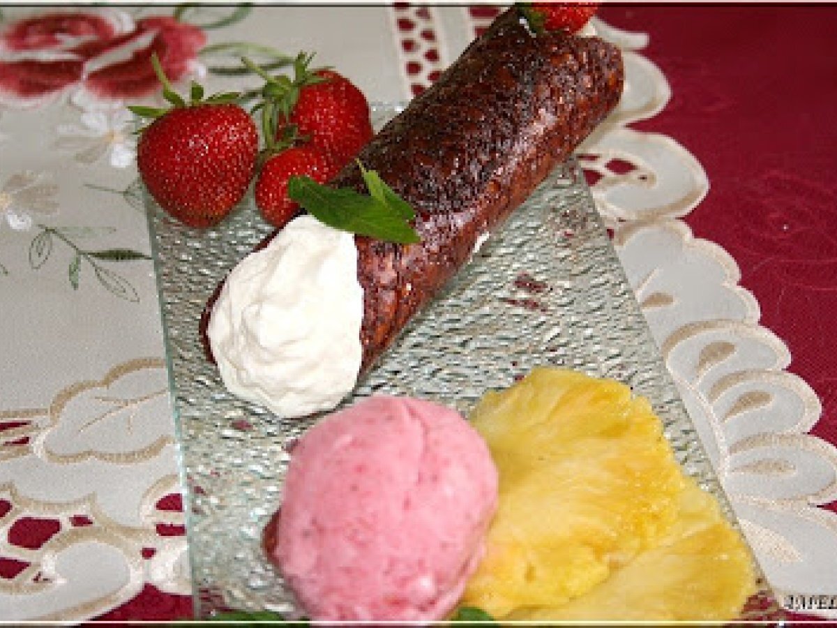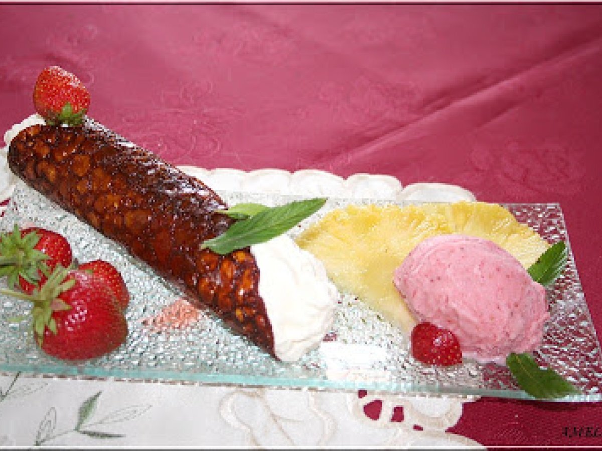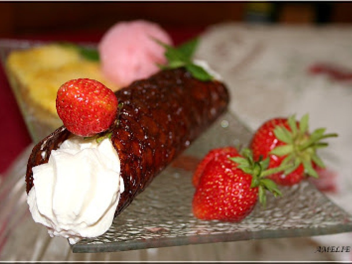 Une tuile au jus d'ananas, roulée et garnie de Chantilly et de fraises marinées, accompagnée d'une glace aux fraises maison et d'un carpaccio d'ananas.