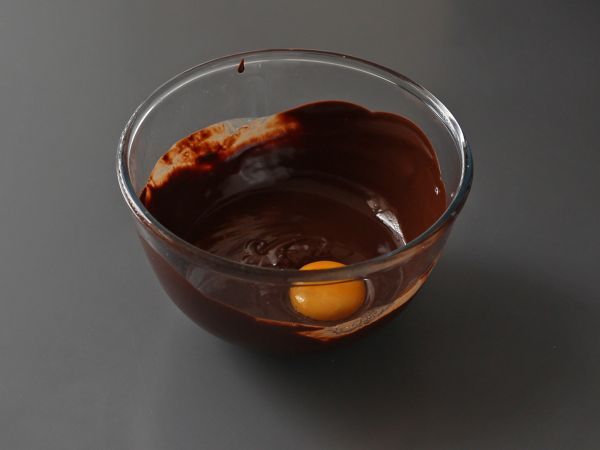 Ajouter le jaune d'œuf dans le mélange de chocolat et beurre fondu.