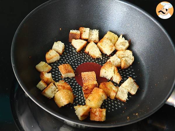 Couper le pain en morceaux, et les faire revenir dans de l'huile d'olive chaude.