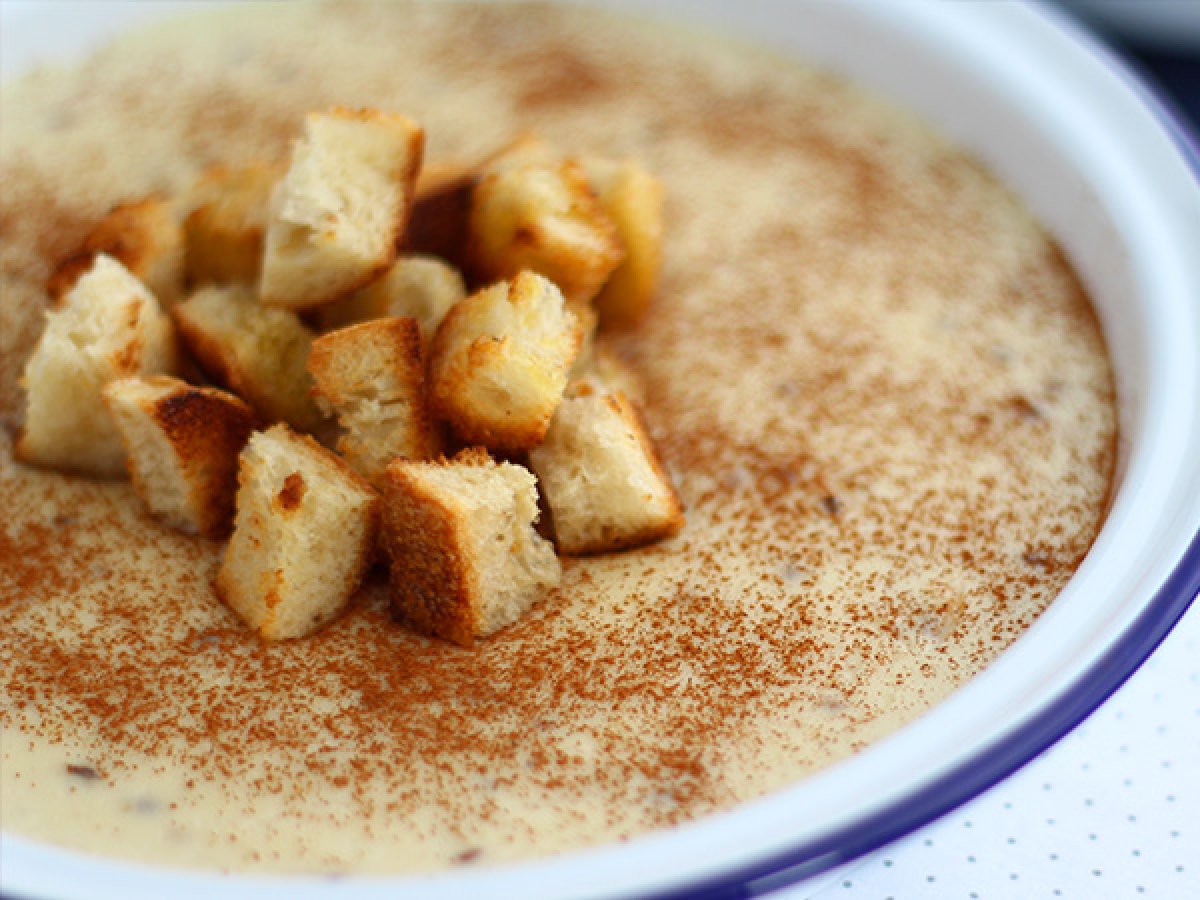 Disposer les croûtons sur la crème, après l'avoir saupoudrée de cannelle moulue.
