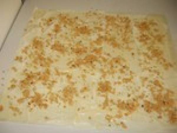 Etaler une feuille filo sur le plan de travail. La badigeonner du mélange tiède de beurre fondu dans l'huile. Superposer une seconde feuille de pâte que l'on beurre également. Parsemer la surface de la pâte d'une poignée de l'appareil à baklawa. Il ne faut pas être tenté de remplir complètement le feuille filo, le mélange doit être clairsemé pour éviter une épaisseur trop importante et un débordement de la farce lors du pliage.