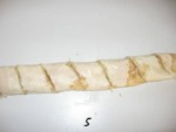 Plier la pâte en bandes de 4 cm de largeur de chaque côté. Badigeonner au beurre fondu entre chaque pliage. Le pliage doit se faire de façon assez serrée, il faut que les bandes restent aplaties. La forme finale donnera deux rectangles épais et non deux cylindres.
