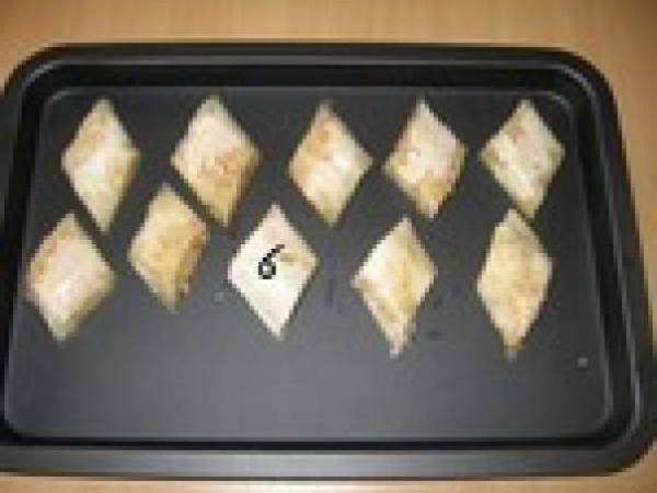Recommencer cette opération jusqu'à épuisement de la farce.- Enfourner pour une bonne demi-heure. La surveillance durant la cuisson est de rigueur. Oter les baklawa une fois qu' elles dorent et que la feuille filo est bien croustillante.
