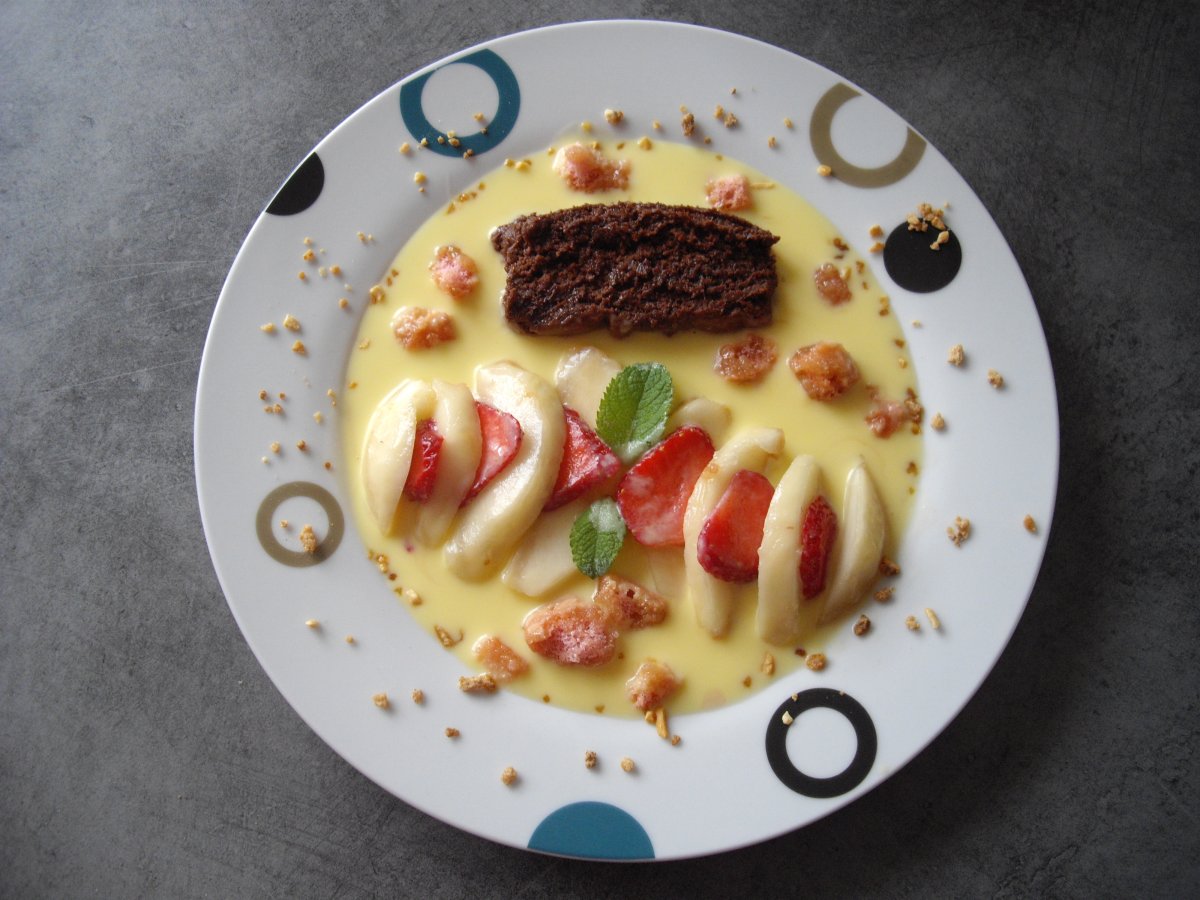 Marquise au chocolat et biscuits roses Dessertmoyen2 h 15 m Envoyer cette recette à un ami Imprimer cette page Poser une question à l'auteur Publier votre photo de cette recette Ingrédients 8 Pour la marquise : . 180 g de chocolat noir patissier de bonne qualité . 8 biscuits roses ou 95 g de poudre . 100 g de beurre . 3 oeufs extra-frais . 40 g de sucre glace - 1 sachet de sucre vanillé . un moule à cake Pour la garniture : . Crème anglaise . 5 poires Williams et autre fruit selon la saison : fraise, kiwi, bananes... . 100 g de cassonade . 7O g de beurre . 1 cuillère à café de marc de Champagne . 4 ou 5 biscuits roses . Quelques feuilles de menthe . Pépites caramélisées Vahiné ou noisettes concassées.