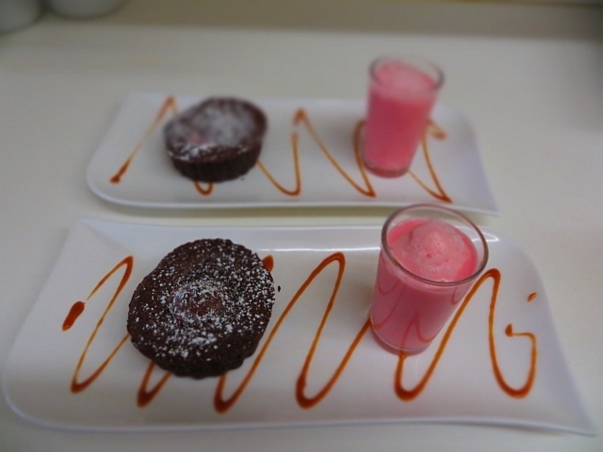 Mi-cuit au chocolat, coeur tagada, milk shake à la fraise
