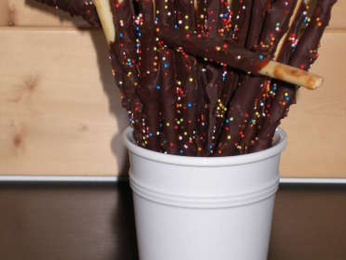 Verser le chocolat fondu sur les gressins au 3/4 de leur longueur, les retourner pour qu'ils soient bien couverts de chocolat et saupoudrer-les de vermicelles.