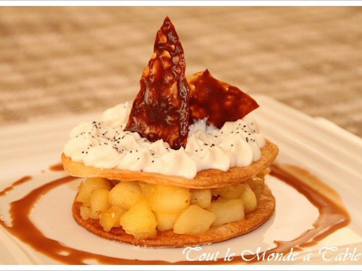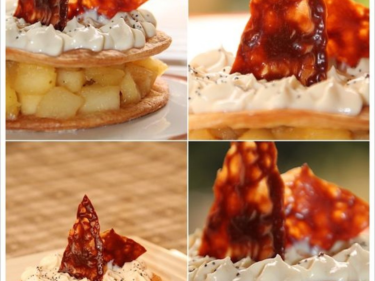 Mille feuille aux pommes caramélisés , ricotta au gingembre , tuile carambar PrécédentSuivant Dessertmoyen50 min Envoyer cette recette à un ami Imprimer cette page Poser une question à l'auteur Publier votre photo de cette recette Ingrédients 2 1/ 5 pommes acidulées 15 g de beurre poivre du moulin 4 Cuillères à Soupe de sucre roux 250 g de ricotta 2 Cuillères à Soupe de sucre en poudre 1 à 2 cuillères à café de gingembre en poudre graines de pavot pour la déco tuiles carambar sauce carambar 1 rouleau de pâte feuilletée pur beurrre 2/ 100 g de crème liquide 6 carambars 1 pincée de fleur de sel