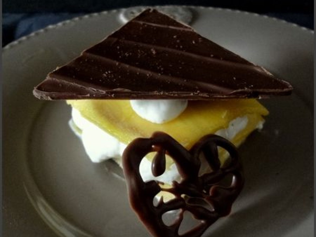 Millefeuille de mangue garni de crème chiboust à la cardamome et décors en chocolat