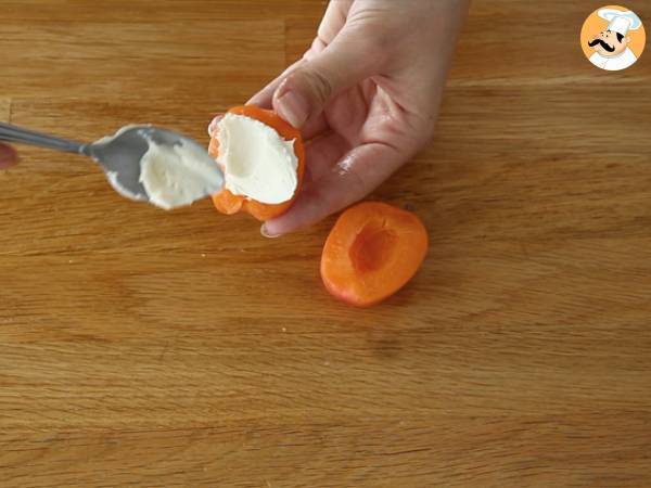 Nettoyez les abricots, coupez les en 2 et ôtez leur noyau. Remplissez le creux du mélange de mascarpone+sucre mis de côté, et refermez les abricots.
