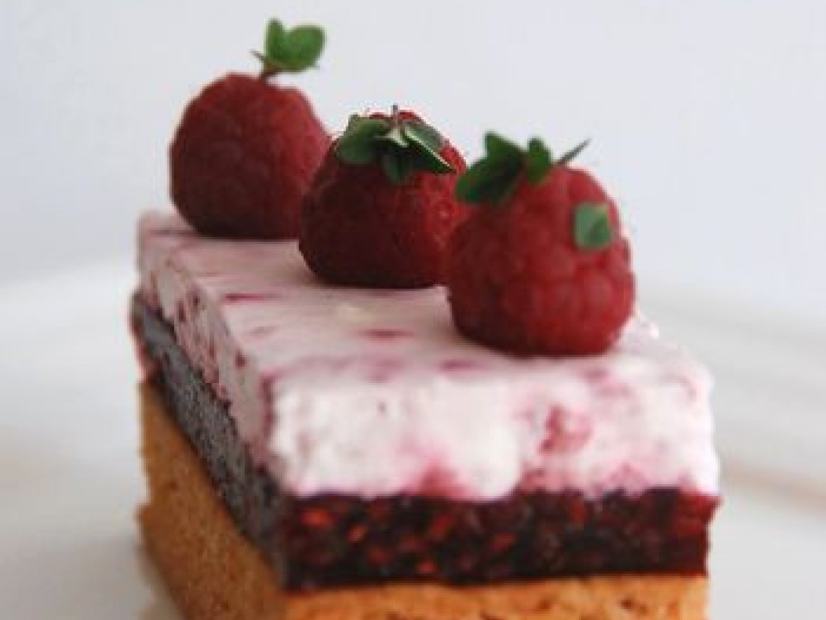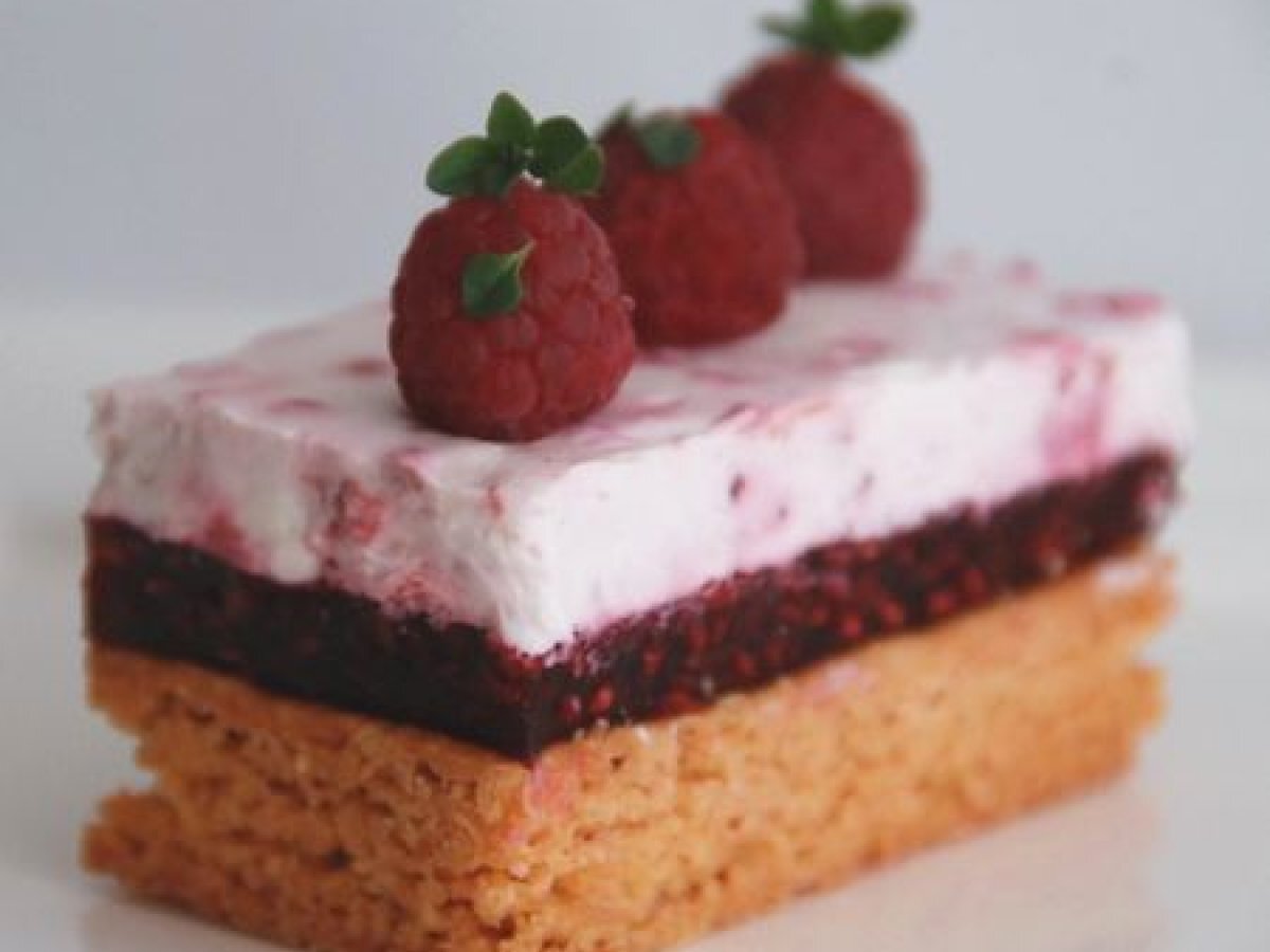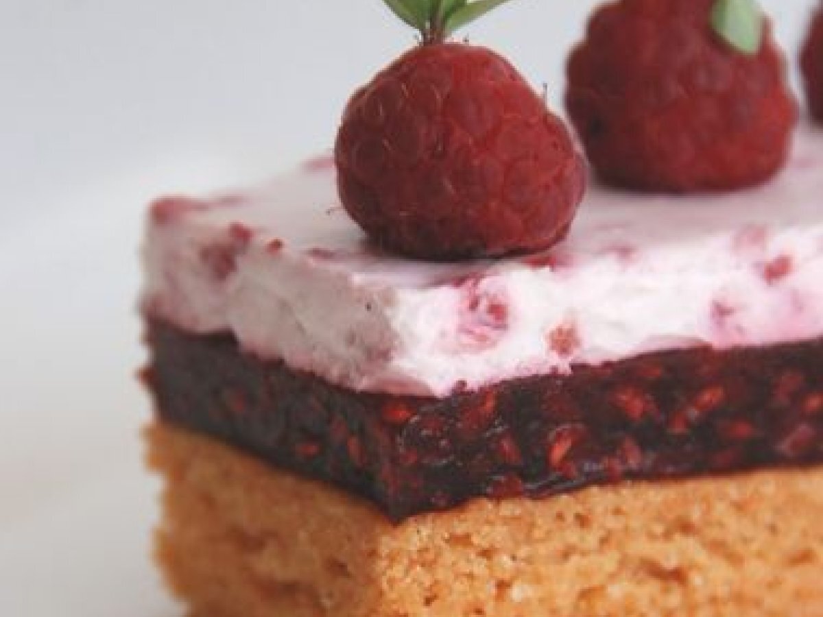 Mousse et gélifié de framboises sur sablé breton aux biscuits roses de reims