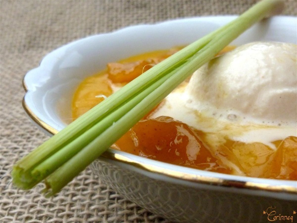 Nage de mangues,crème glacée coco, citronnelle et gingembre Dessertmoyen30 min Envoyer cette recette à un ami Imprimer cette page Poser une question à l'auteur Publier votre photo de cette recette Ingrédients 6 2 mangues ou 3 si elles ne sont pas grosses (J'ai eu la chance d'en trouver de très grosses et excellentes, parfumées et sucrées à souhait, chez mon petit fruitier) 1 citron vert 1 orange (ou 1 verre de jus d'orange) 20cl de lait de coco 20cl de lait concentré non sucré 50gr de cassonade + 2 cuillères à soupe 1 tige de citronnelle 1/2 cuillère à café de gingembre frais râpé 25gr de beurre