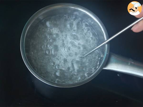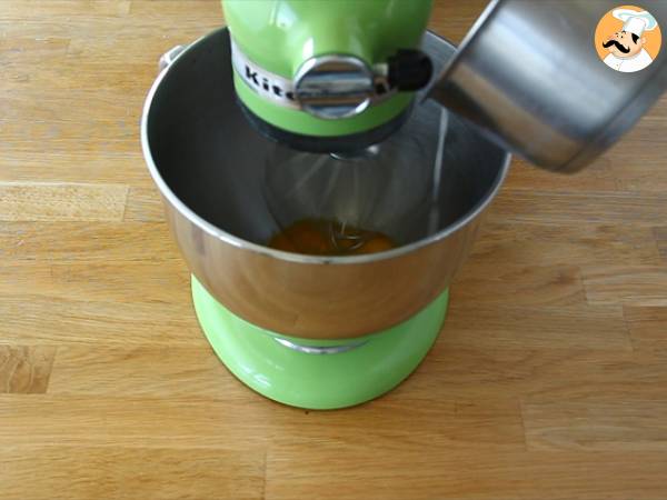 Dans le bol du robot, mettez les jaunes d’œufs. Dans une casserole, mettez l'eau et le sucre et portez à ébullition. Mettez le thermomètre et attendez d'atteindre 115°C.