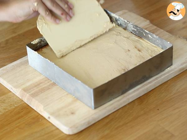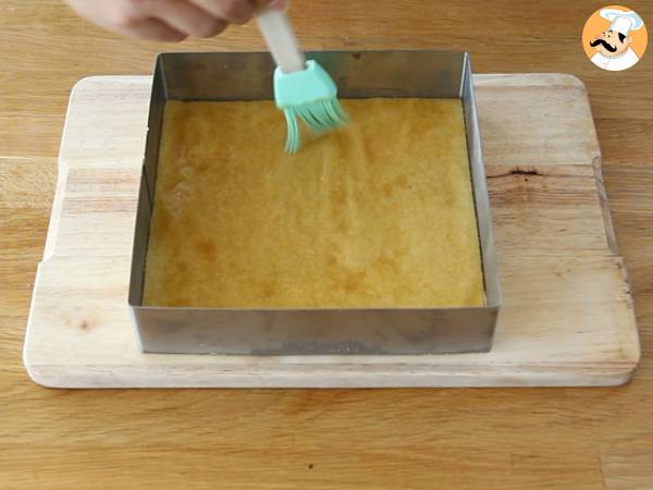 Sur le plat de service, placez votre cadre à pâtisserie. Placez un carré de biscuit au fond, et imbibez-le du sirop préparé précédemment à l'aide d'un pinceau.