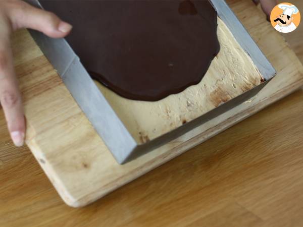 Versez le chocolat sur l'Opéra, et penchez le cadre afin de répandre le chocolat sur toute la surface. Mettez au frais 15 minutes afin que le chocolat prenne.