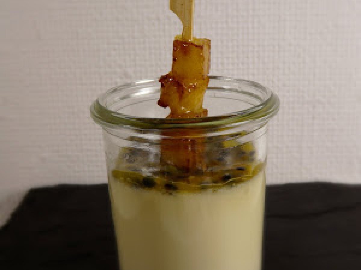 Panna cotta au chocolat blanc coulis passion brochette ananas caramélisé