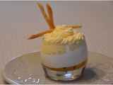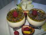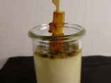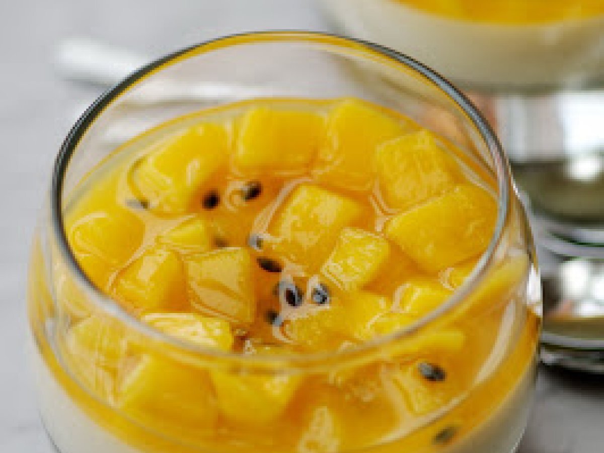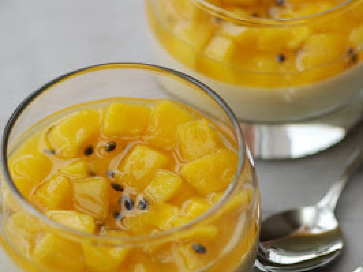 Panna cotta au chocolat blanc, mangue thaïe, fruit de la passion et sirop.