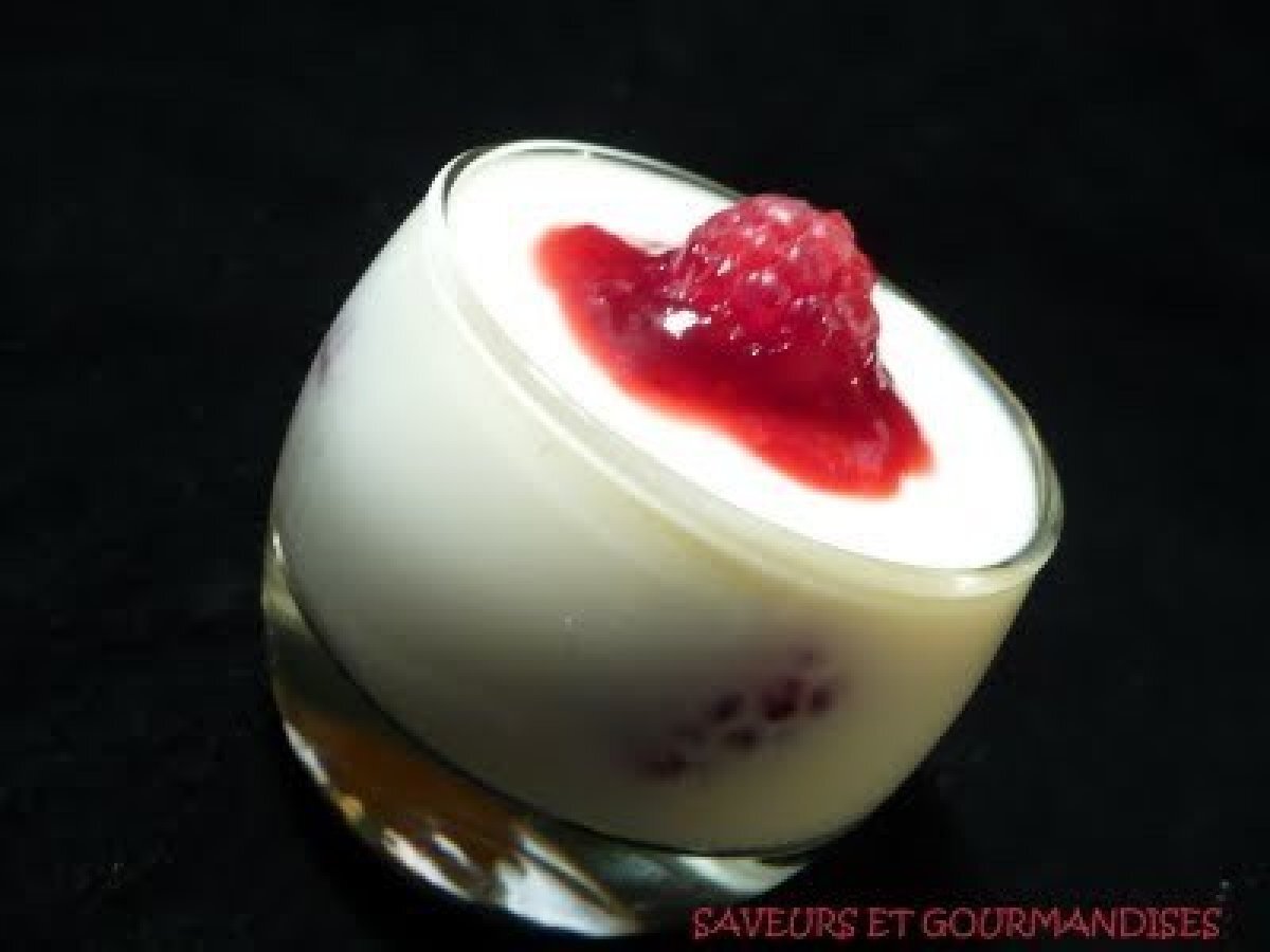 Panna cotta aux framboises. PrécédentSuivant Dessertfacile20 min251 Kcal Envoyer cette recette à un ami Imprimer cette page Poser une question à l'auteur Publier votre photo de cette recette Ingrédients 4 200 ml de crème fraiche liquide entière 100 gr de mascarpone 100 gr de fromage blanc 50 gr de sucre 1 barquette de framboises 2 feuilles de gélatine. Coût estimé: 3.85Euros€ (0.96€/part)