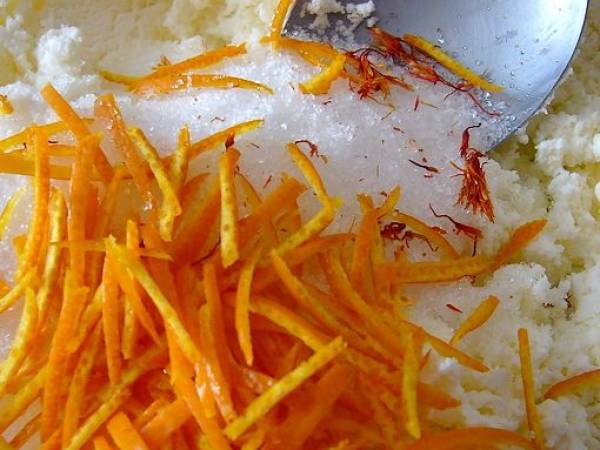 Dans un saladier, mélanger la ricotta avec l'oeuf. Ajouter le sucre, la farine, le safran et les zestes d'agrumes.- Bien mélanger jusqu'à l'obtention d'une préparation bien homogène. Placer au frigo une dizaine de minutes.