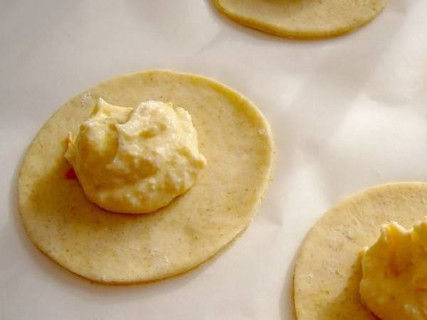 Placer les cercles de pâte sur une plaque recouverte de papier de cuisson. Mettre au centre de chaque cercle 2 cuillères à café de garniture.