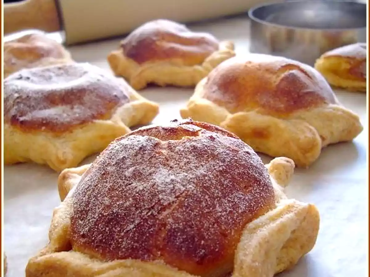 Pour que la farce ne s'échappe pas, pincer 2 côtés de pâte opposés puis renouveler 2 fois cette opération pour avoir 8 pointes en tout.- Faire cuire 25 minutes environ dans un four préchauffé à 180 degrés. Laisser tiédir puis saupoudrer de sucre glace.