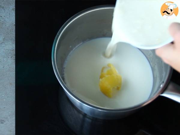 Mettez 150 ml de lait à chauffer avec la peau du citron. Délayez la farine avec le reste du lait (100 ml). Lorsque le lait commence à frémir, ajoutez le mélange lait-farine, et mélangez constamment au fouet. Le mélange devrait épaissir en quelques minutes.