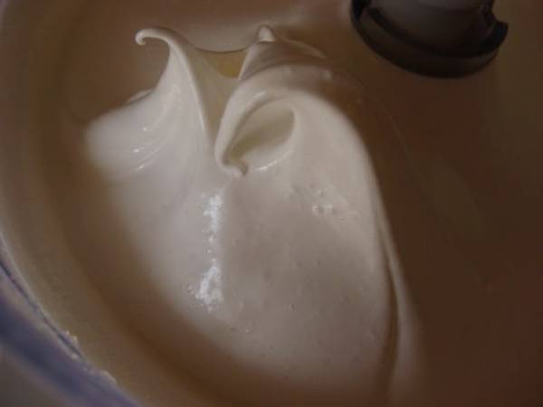 Ajoute vinaigre et Maïzena et on continue à battre. Je n'avais pas une vision très nette de ce qui se passait dans le bol du robot et je m'inquiétais de ne pas voir de pics au passage du fouet.