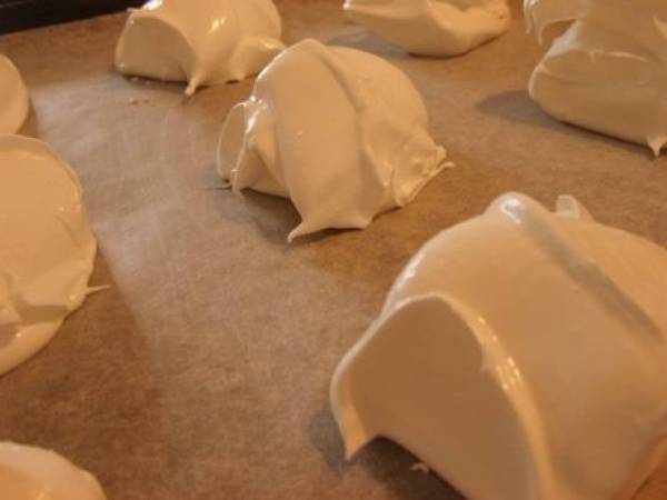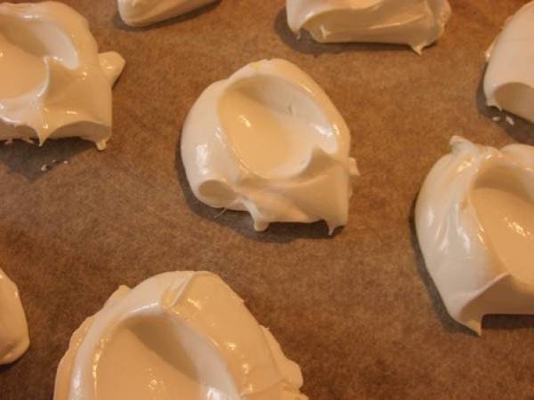 Enfoncé légèrement une cuillère à soupe sur le dessus des meringues pour créer un petit creux et j'ai enfourné pour une bonne heure et demie à 130°.