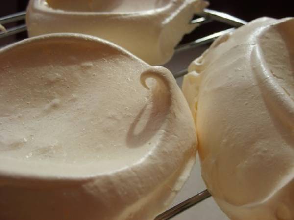 On obtient des meringues croquantes à l'extérieur et mousseuses à l'intérieur.- Une ou deux heures avant de servir, garnir les pavlovas avec une briquette de crème et un peu de sucre.