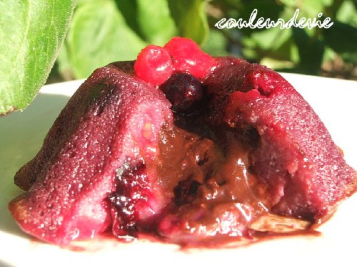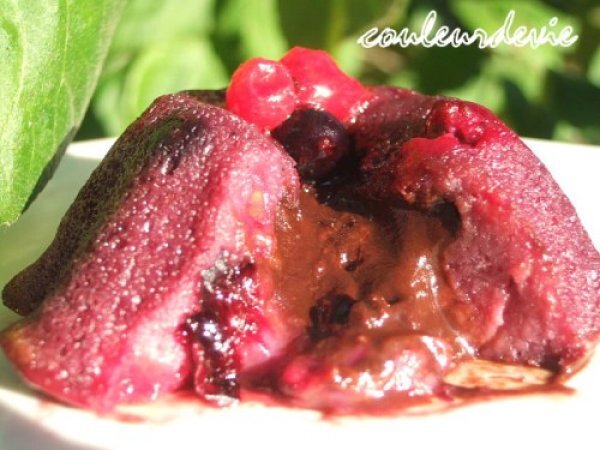 Petit moelleux aux fruits rouges, coeur coulant chocolat noir PrécédentSuivant Dessertfacile37 min224 Kcal Envoyer cette recette à un ami Imprimer cette page Poser une question à l'auteur Publier votre photo de cette recette Ingrédients 6 Pour la pâte : 200 g de coulis de framboises ,ou mixer très finement au thermomix 150 g de fruits rouges avec 40 g de sucre et passé le tout au chinois. 50 g de fruits rouges (de framboises) 3 oeufs 2 cuillères à soupe bien pleines de maïzena 80 g de sucre en poudre Pour les coeurs chocolat : 70 g de chocolat noir à pâtisser 20 g de beurre 3 cuillères à soupe de crème fleurette Coût estimé: 4.36Euros€ (0.73€/part)