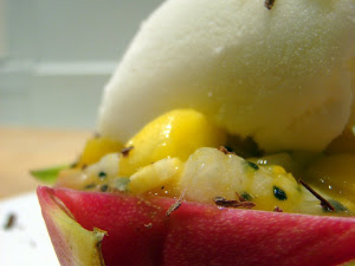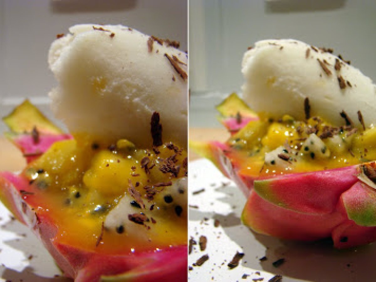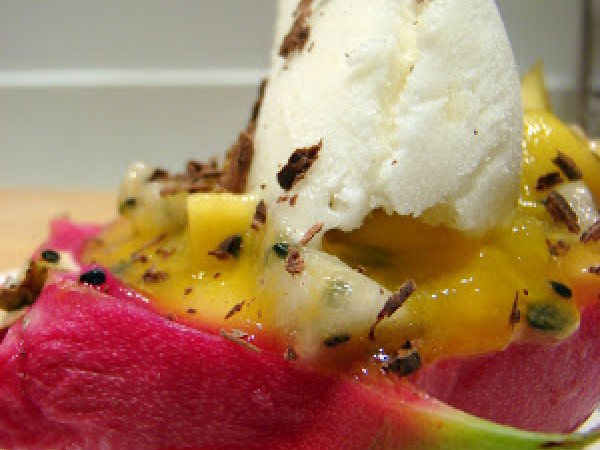 Pitahaya, mangues, fruits de la passion, salade de fruits haute en couleurs et en craquant