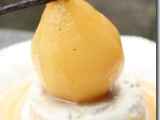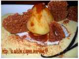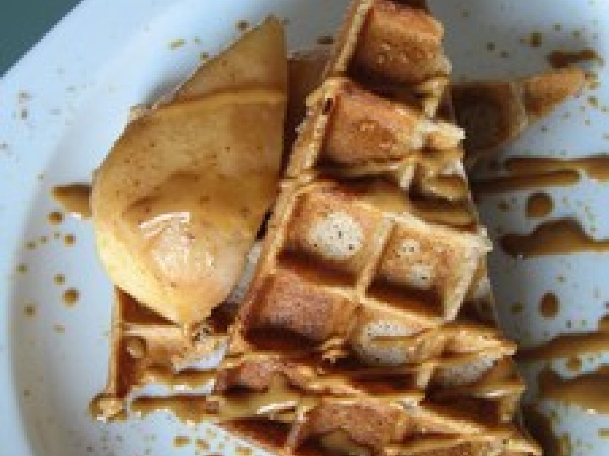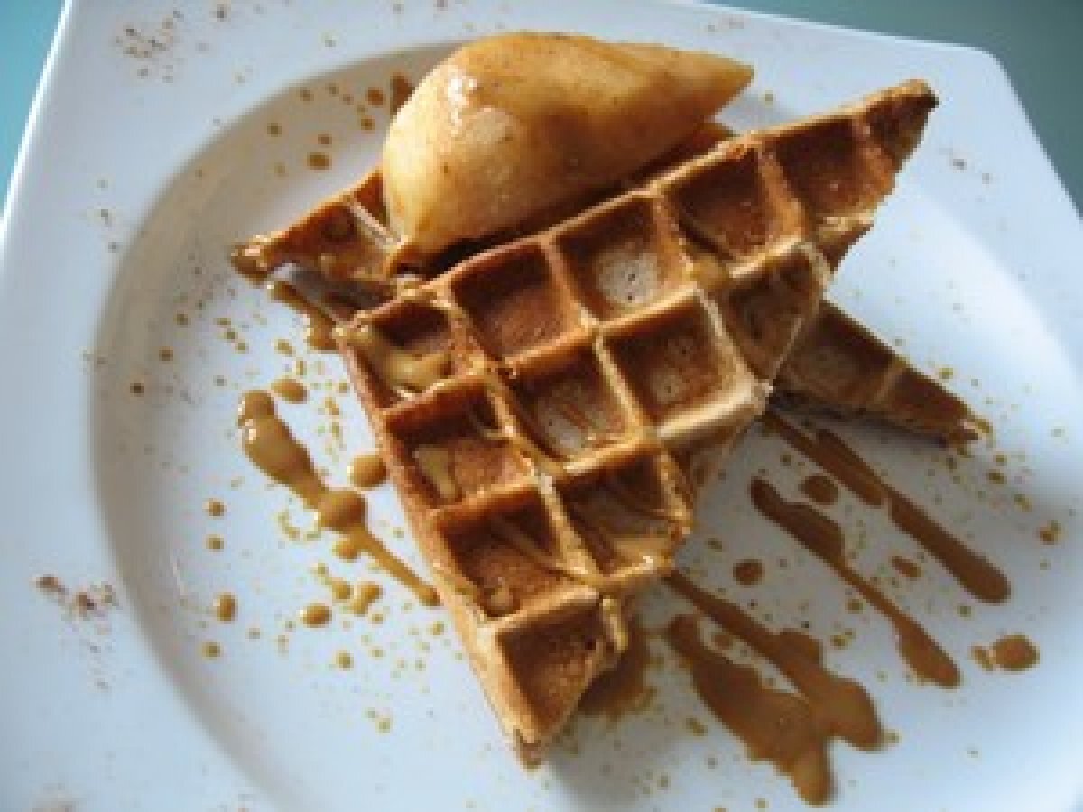 Poire vedette : gaufre à la farine de châtaigne, poire aux épices ..