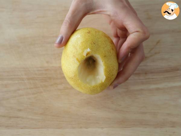 Variantes: vous pouvez tout aussi bien prendre du beurre de cacahuètes ou encore de la purée d'amandes. Nous ne vous conseillons pas de mettre des carrés de chocolat dans le creux de la poire car même s'ils vont fondre lors de la cuisson au four, ils risquent de durcir de nouveau lors de la dégustation, et le résultat sera bien moins bluffant.