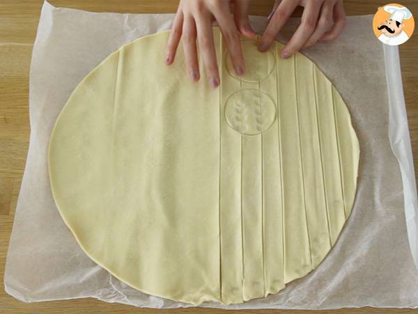 • Poires feuilletées au cœur chocolat - Préparation etape 2Couper des bandes de pâte feuilletée, et à l'aide d'un emporte-pièce, marquer 4 cercles un peu plus grands que le bas des poires.