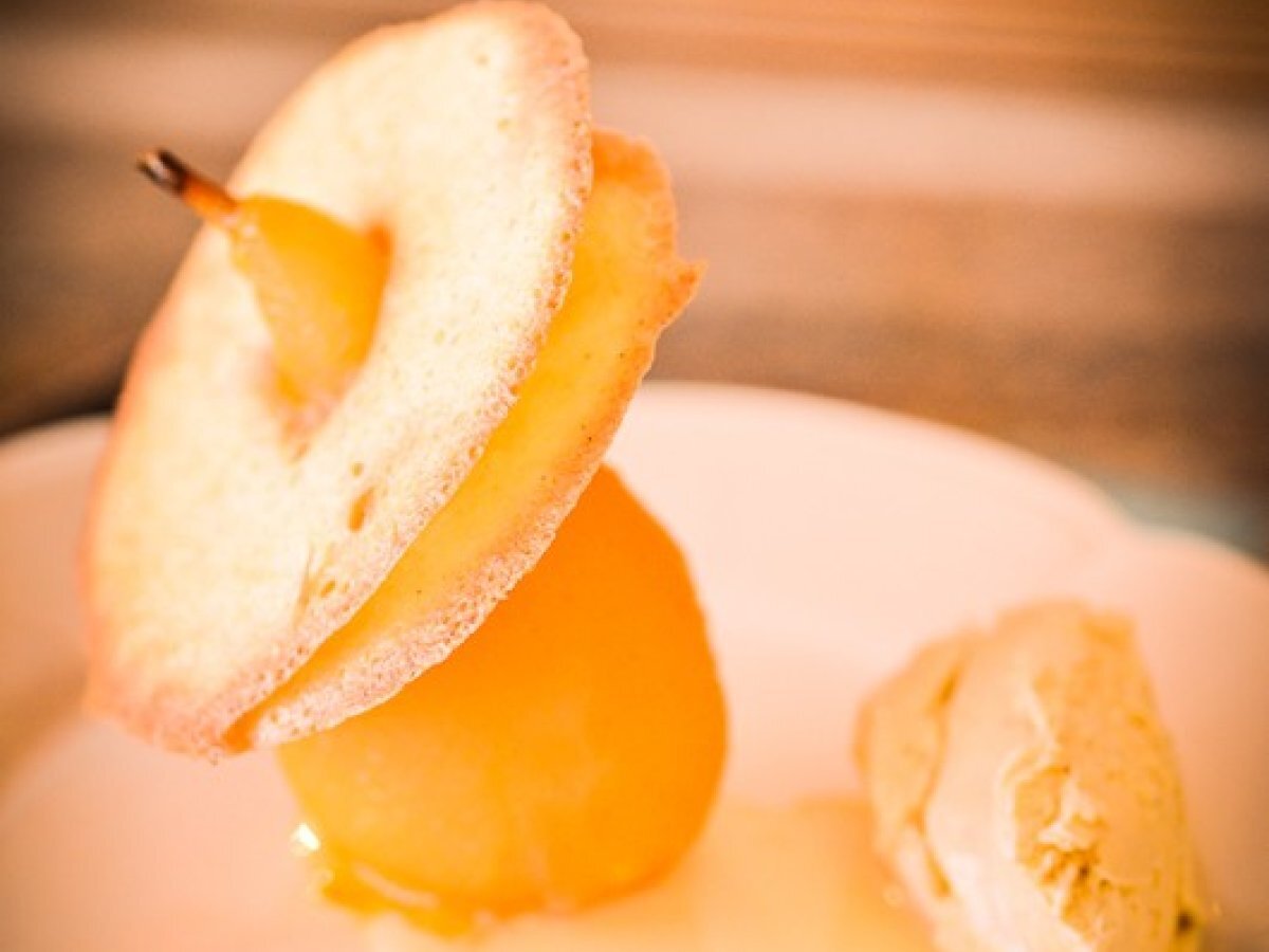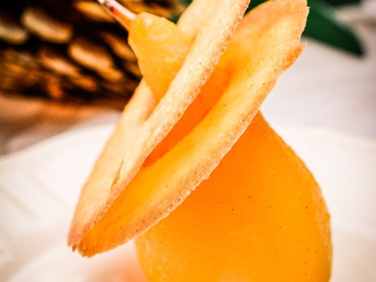 Poires pochées au jus d’orange, langue de chat en disque, ganache de chocolat blanc