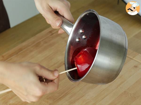 Dans une casserole à feu fort, mettre le sucre, et ajouter un peu d'eau, ainsi que quelques gouttes de colorant alimentaire rouge (facultatif).